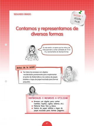 Este documento presenta una lección para estudiantes de segundo grado sobre cómo contar cantidades de objetos de 10 en 10 y representar números de diferentes formas. La lección guía a los estudiantes a agrupar 86 semillas en sobres de 10 cada uno, excepto 6 semillas restantes, y luego representar el número total de 86 de varias maneras como con el ábaco, regletas de colores y el sistema de posición valor.