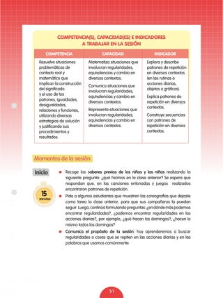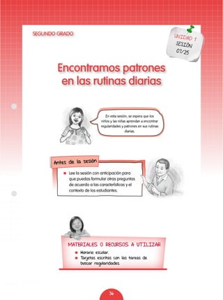 Este documento presenta una sesión para enseñar a los estudiantes a encontrar patrones y regularidades en sus rutinas diarias. La sesión comienza con una discusión sobre patrones encontrados en actividades anteriores y en el horario escolar. Luego, los estudiantes trabajan en parejas para identificar patrones en diferentes contextos de su vida diaria y los presentan a la clase. La sesión concluye con una reflexión sobre la importancia de las rutinas y regularidades.