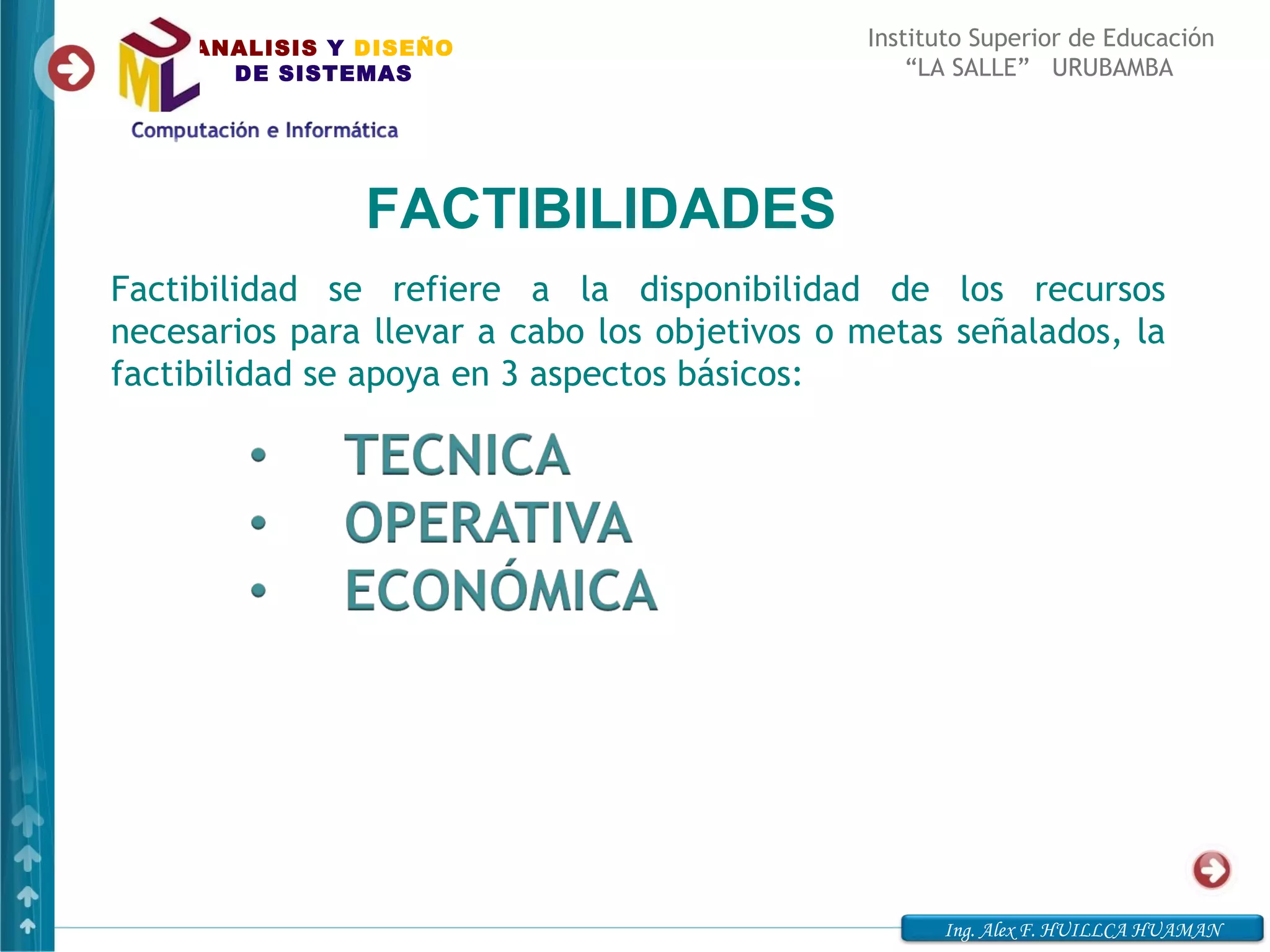 El documento habla sobre la factibilidad de proyectos, la cual se divide en tres aspectos: factibilidad técnica (disponibilidad de recursos técnicos), factibilidad económica (disponibilidad de recursos financieros) y factibilidad operativa (disponibilidad de recursos humanos y procesos para la operación del proyecto). Se enfatiza la necesidad de estudiar cada uno de estos aspectos para determinar la viabilidad de un proyecto.