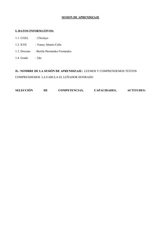 Este documento presenta una sesión de aprendizaje sobre la comprensión de textos narrativos para estudiantes de segundo grado. La sesión se centra en la lectura y discusión de la fábula "El leñador honrado" e incluye actividades antes, durante y después de la lectura para desarrollar la comprensión lectora de los estudiantes. El objetivo de aprendizaje es que los estudiantes comprendan textos narrativos como las fábulas.