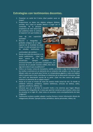 El documento proporciona recomendaciones para que los profesores despierten el interés de los estudiantes en la historia, incluyendo darles oportunidades para participar activamente fuera del aula, visitar museos y sitios históricos, y escribir cartas en persona de figuras históricas. También discute el uso de testimonios históricos y el contexto para ayudar a los estudiantes a comprender eventos del pasado.
