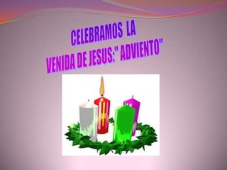 Este documento describe la celebración del Adviento en la iglesia. El Adviento es el tiempo de preparación para la Navidad que se representa con una corona de Adviento con cuatro velas de colores diferentes. Cada domingo se enciende una vela nueva para celebrar la fe, el amor, la justicia y la esperanza a la llegada de Jesús durante las cuatro semanas previas a la Navidad. El documento explica el significado de cada vela y las reflexiones para cada domingo de Adviento.