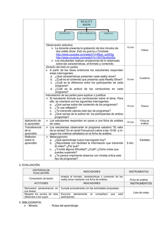 Este documento describe una sesión de aprendizaje sobre reality shows. La sesión tiene como objetivo analizar el formato, características y contenido de los reality shows. La docente motiva a los estudiantes mediante videos y preguntas. Luego, presenta información sobre los reality shows y los estudiantes organizan la información en un esquema. Más adelante, analizan videos de dos reality shows peruanos completando una ficha. Finalmente, los estudiantes reflexionan sobre lo aprendido y evalúan programas de televisión con una mirada crítica