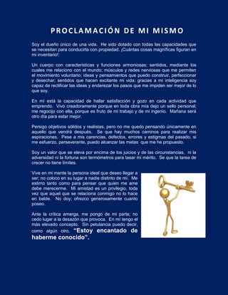 El documento describe las capacidades y cualidades inherentes a la vida humana. Enumera las características físicas y mentales que permiten a los individuos conducir sus vidas de manera creativa y alcanzar objetivos. Afirma que cada persona es único dueño de su vida y tiene el potencial de superar dificultades mediante el esfuerzo y la perseverancia para lograr las metas que se propone.