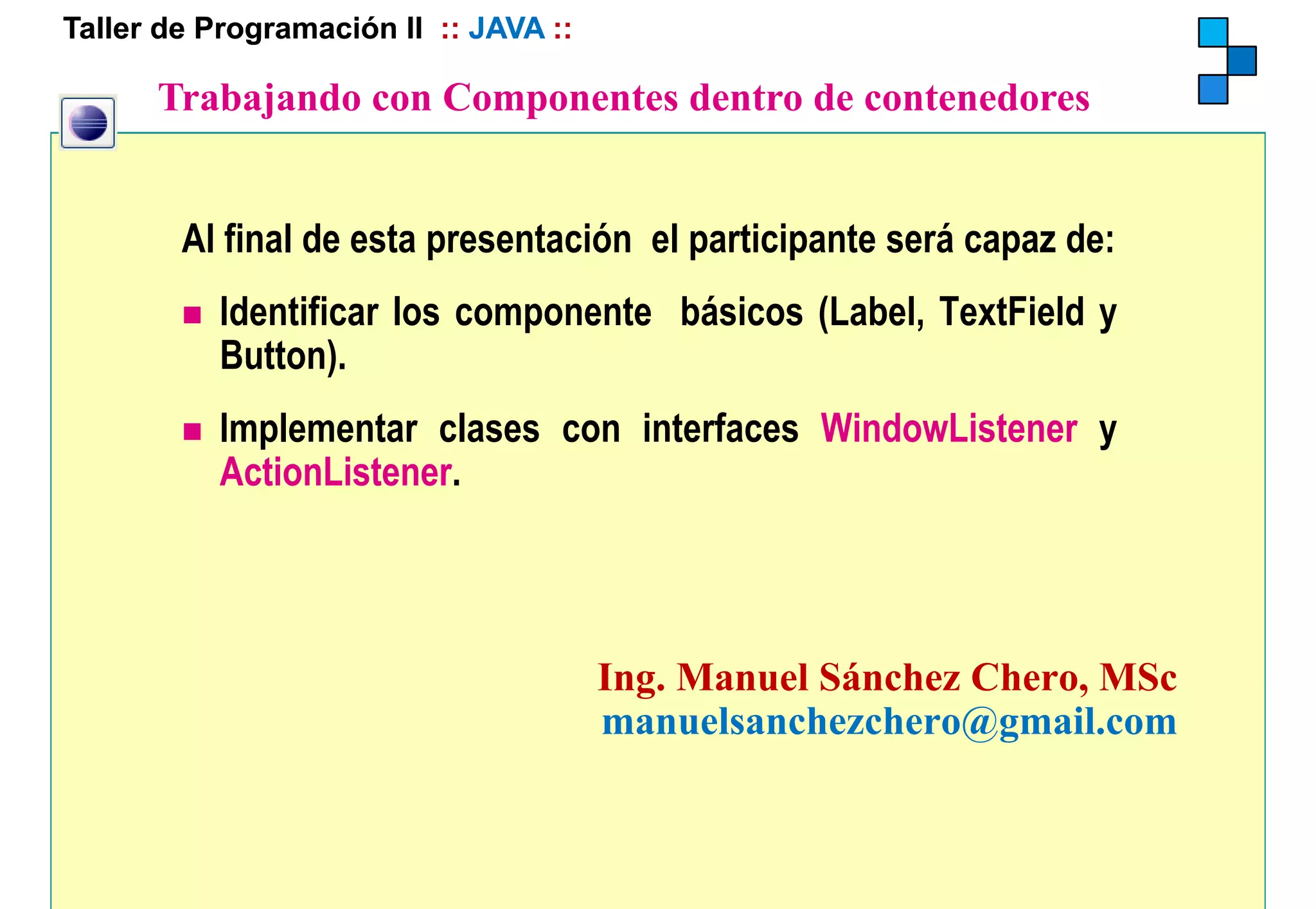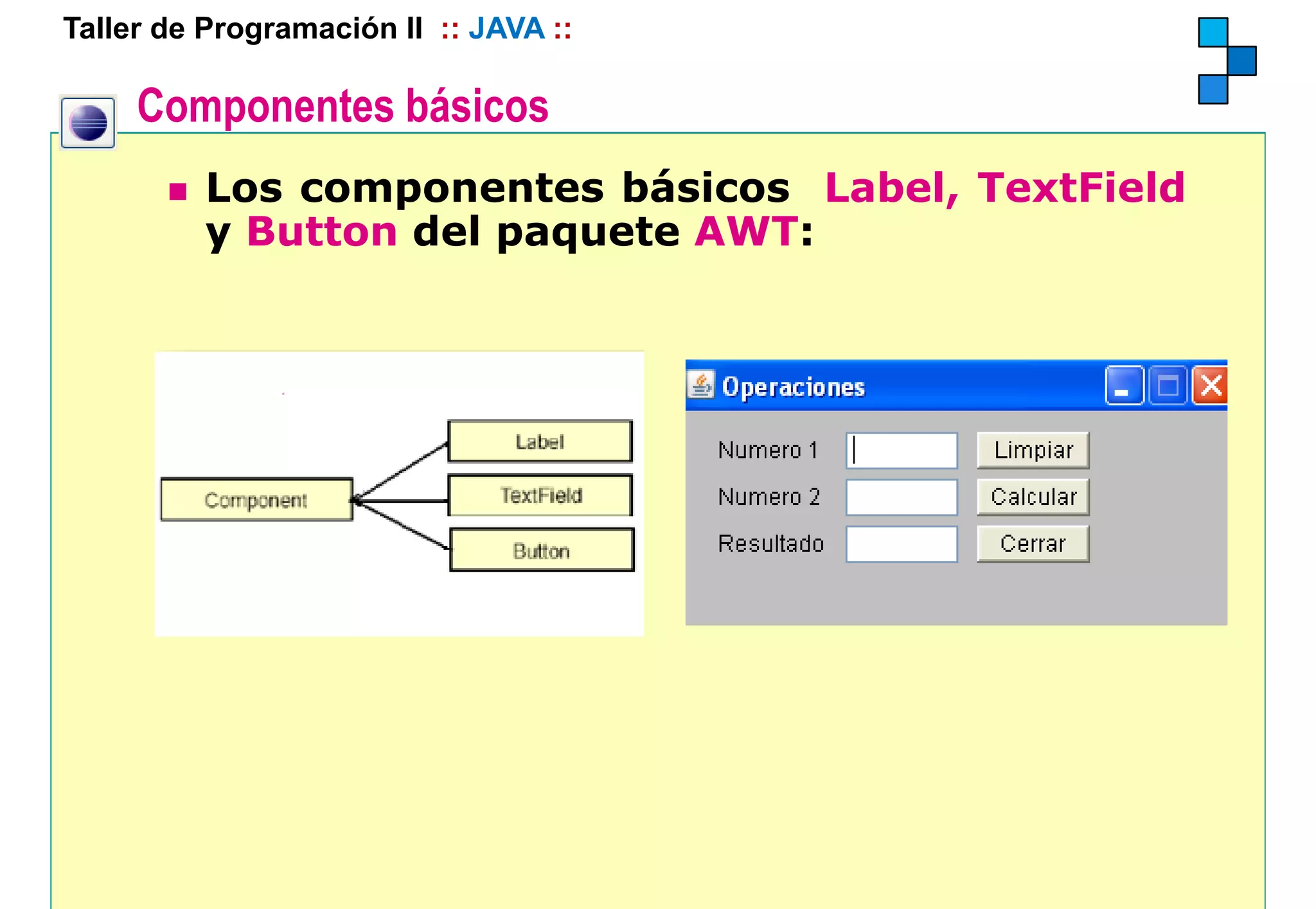 Este documento describe los componentes básicos de Java AWT como etiquetas, cuadros de texto y botones. Explica cómo crear y usar estos componentes mediante constructores, métodos y eventos para desarrollar interfaces gráficas de usuario simples como una calculadora básica.