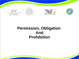 El documento habla sobre los verbos modales que se usan para expresar permiso, prohibición y obligación. Explica que 'can', 'may' y 'could' se usan para mostrar permiso, mientras que 'can't' y 'mustn't' indican prohibición. También cubre las diferencias entre 'have to' y 'must' para expresar obligación, y el uso de 'don't have to' para mostrar falta de obligación. Finalmente, resume los tres tipos de oraciones condicionales que usan 'if'.
