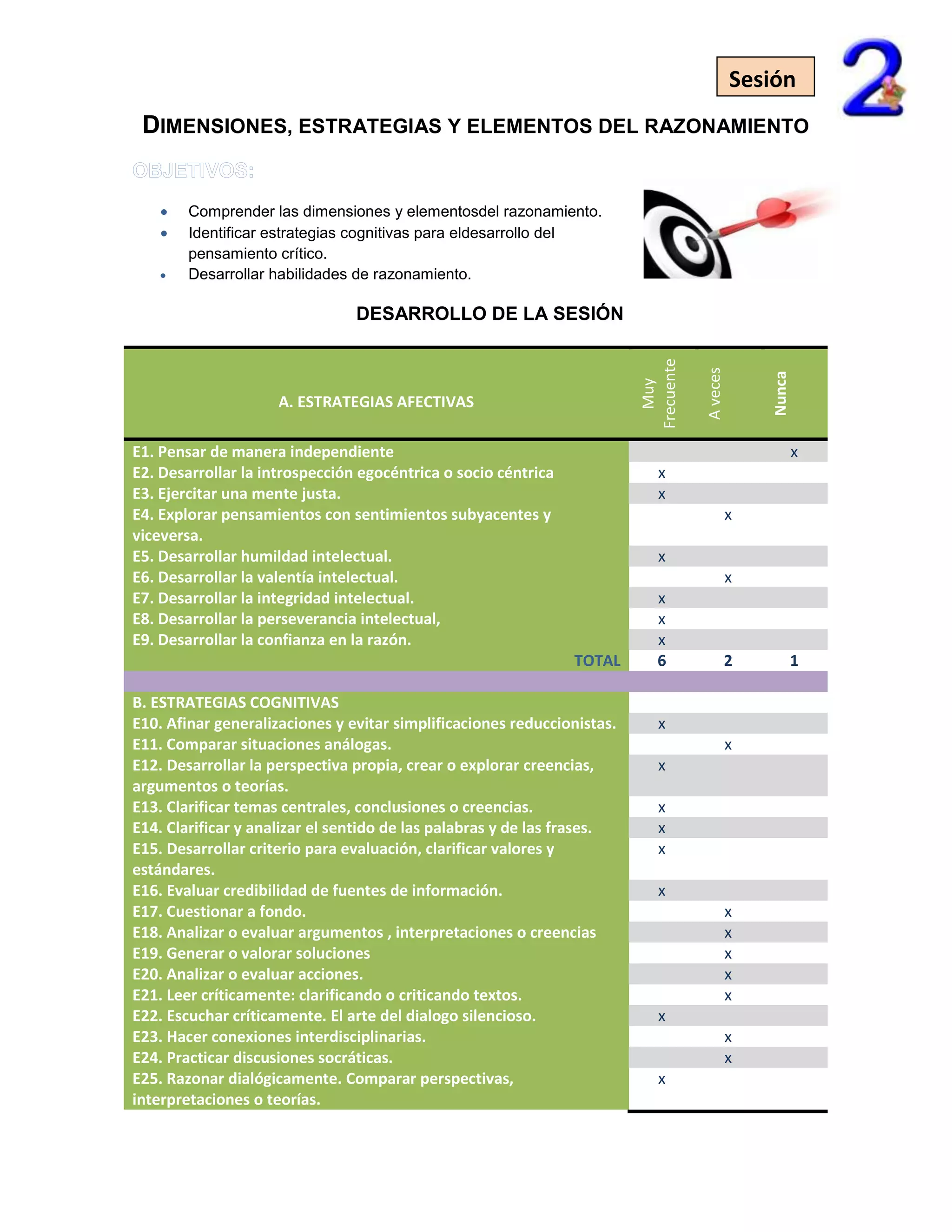 Este documento describe estrategias y elementos para el desarrollo del razonamiento crítico. Presenta 31 estrategias cognitivas y afectivas como pensar de manera independiente, desarrollar la introspección, cuestionar a fondo y analizar argumentos. Establece estándares intelectuales como claridad, exactitud y profundidad. El objetivo es identificar cómo aplicar estas estrategias y elementos para mejorar las habilidades de razonamiento.