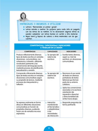 Este documento presenta la segunda sesión de una unidad sobre el conocimiento de los estudiantes y la escritura de sus nombres. La sesión tiene como objetivo que los estudiantes usen y escriban sus nombres para presentarse. Se realizarán actividades como observar letreros, cantar una canción sobre los nombres, y dibujarse a sí mismos para escribir sus nombres y colocarlos en el aula.