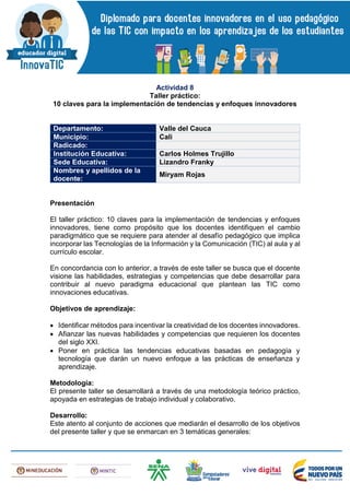 Este documento presenta un taller práctico sobre 10 claves para la implementación de tendencias y enfoques innovadores en la enseñanza. El taller busca que los docentes identifiquen los cambios necesarios para incorporar las TIC en el aula y currículo, y desarrollen habilidades para contribuir al nuevo paradigma educativo. El taller se centra en nuevas habilidades del siglo 21, políticas de acceso a TIC, y los desafíos de adaptar la educación al siglo 21.