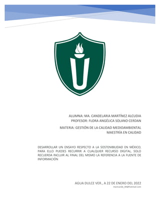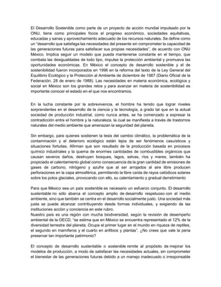 El documento analiza la sostenibilidad en México, enfatizando la necesidad de un desarrollo sostenible que satisfaga las necesidades actuales sin comprometer a futuras generaciones. Destaca los retos económicos, ecológicos y sociales, así como las acciones necesarias, incluyendo el uso de energías renovables, la educación y la preservación del medio ambiente. Además, menciona la urgencia de implementar políticas y programas efectivos para combatir el cambio climático y mejorar la calidad de vida en el país.
