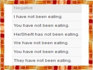 Este documento explica los usos del pasado perfecto continuo, presente perfecto continuo y futuro perfecto continuo en inglés. Describe cómo se forman estas construcciones verbales, incluyendo oraciones afirmativas, negativas e interrogativas. También proporciona ejemplos para ilustrar cómo se usan estas formas verbales para hablar de acciones en curso o que comenzaron en el pasado y continúan en el presente o futuro.