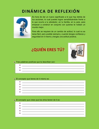 El documento habla sobre la necesidad de darle un nuevo significado a nuestras acciones a través de la sensibilización sobre lo que ocurre a nuestro alrededor y construir un mundo mejor juntos. Esto requiere un cambio de actitud positiva y confianza en uno mismo.