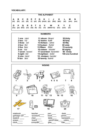 El plan de lección describe una lección de inglés para estudiantes de primer y segundo grado. La lección se enfoca en enseñar el alfabeto, números y sustantivos relacionados al salón de clase a través de repetición, deletreo y resolución de operaciones matemáticas simples. La lección dura 2 horas y evalúa la comprensión y expresión oral de los estudiantes.
