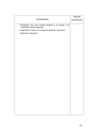 Este documento presenta la planificación de 6 sesiones de aprendizaje de una semana para un tercer grado. Cada sesión incluye estrategias, medios y materiales para actividades como canciones, cuentos, ejercicios sobre conjuntos matemáticos y normas de convivencia. El objetivo general es que los estudiantes se reencuentren con alegría después de las vacaciones.