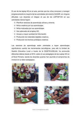 Este documento tiene como objetivo reforzar el uso pedagógico de las laptops XO en primaria. Detalla procedimientos básicos de las actividades de las laptops XO y cómo los estudiantes demuestran sus habilidades con la nueva versión 9 de Fedora. El documento también describe cómo el uso de las laptops XO en el aula permite a los niños conocer y manejar progresivamente las actividades del entorno SUGAR, y cómo los docentes pueden planificar sesiones activas y lograr otros objetivos educativos al integrar el uso de las