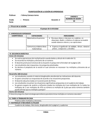 La planificación describe una sesión de aprendizaje sobre la propagación del Aedes Aegypti. Los estudiantes aprenderán a reconocer datos y relaciones para expresar un modelo usando múltiplos y divisores. El docente presentará una situación sobre la cantidad de huevos puestos por un zancudo en 15 días y los estudiantes deberán resolver el problema usando el concepto de múltiplos.