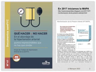 Este documento proporciona recomendaciones sobre qué hacer y no hacer en el tratamiento de la hipertensión arterial. Entre las cosas que se recomienda hacer se encuentran medir la presión arterial de forma correcta, evaluar el riesgo cardiovascular global, administrar medicación antihipertensiva antes de acostarse, y utilizar combinaciones sinérgicas de fármacos. También se recomienda evaluar la presión arterial ambulatoria mediante monitorización ambulatoria en la mayoría de pacientes. Entre las cosas que no se recomienda hacer están establecer el
