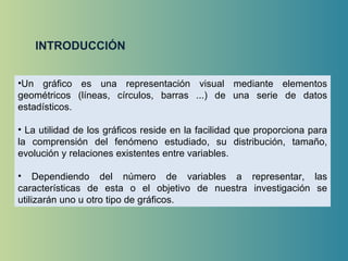 Este documento describe diferentes tipos de representaciones gráficas de datos estadísticos, incluyendo gráficos lineales para mostrar la evolución de variables con el tiempo, gráficos de barras para comparar variables entre unidades espaciales o temporales, gráficos sectoriales para estudiar la composición de un fenómeno, gráficos triangulares para tres variables relacionadas, climoagramas que combinan barras y líneas para mostrar temperatura y precipitación, e histograma de frecuencia como la pirámide de población para estudiar la e