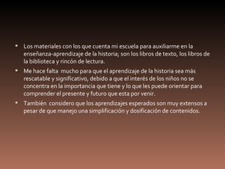 Este documento describe las prácticas de enseñanza de historia de un maestro de primaria. El maestro cree que la historia se vive más que se aprende y ayuda a comprender el contexto personal, local, nacional y mundial. Usa métodos como cuadros comparativos y extracción de información por párrafos para facilitar el aprendizaje de sus alumnos. Los materiales disponibles son libros de texto y de la biblioteca. El maestro siente que hace falta más material para hacer el aprendizaje más significativo, ya que los ni