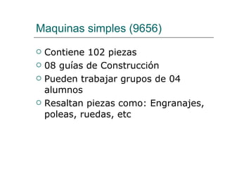 El documento describe un set de maquinas simples para estudiantes de primaria. El set contiene 102 piezas como engranajes, poleas y ruedas para que grupos de 4 estudiantes exploren conceptos de mecánica como palancas, engranajes y energía. El set viene con 8 guías de construcción e instrucciones para 8 proyectos que cubren objetivos de aprendizaje en ciencias, tecnología y matemáticas.