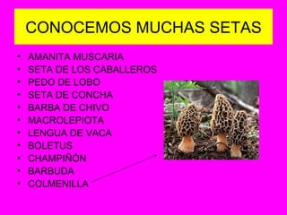 El documento habla sobre las setas. Explica que las setas crecen en los bosques, prados y troncos de árboles, principalmente en primavera y otoño. Detalla las partes de una seta y da normas para recolectarlas de forma segura y sostenible. También incluye adivinanzas sobre setas, ejemplos de setas venenosas y una receta de paella con setas.