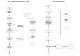 El diagrama de flujo describe los pasos para resolver dos problemas comunes de computadora: 1) cuando el CPU enciende pero no hay video, sugiere revisar los conectores, quitar la estática y probar otro monitor o memoria RAM; 2) cuando no hay sonido, recomienda descargar e instalar los drivers de audio del fabricante y revisar que funcionen correctamente.