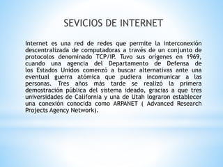 Este documento proporciona una breve historia de Internet, describiendo sus orígenes en 1969 como una red creada por el Departamento de Defensa de EE. UU. para garantizar la comunicación en caso de guerra. Explica que en 1972 se realizó la primera demostración pública de ARPANET, que conectó tres universidades de California y una de Utah. También brinda instrucciones básicas sobre cómo comprimir archivos en Windows.