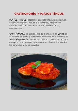 La gastronomía de Sevilla se caracteriza por platos típicos como el gazpacho, el pescado frito y el cazón en adobo, así como por abundantes recursos culinarios de los olivares, viñedos, naranjales y almendrales de la provincia.
