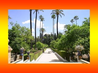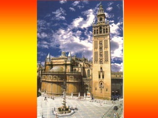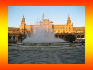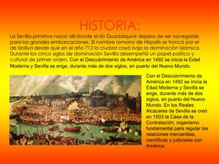 El documento proporciona información sobre la historia y características de la ciudad de Sevilla. Se describe que Sevilla se convirtió en el principal puerto del Nuevo Mundo durante más de dos siglos después del Descubrimiento de América en 1492. También se resumen los detalles sobre algunos de los lugares más importantes de Sevilla como la Catedral, la Giralda, los Reales Alcázares y la Plaza de España.