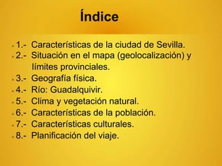 Este documento presenta un trabajo sobre la ciudad de Sevilla, destacando su riqueza histórica, cultural y geográfica. Sevilla, situada en Andalucía, es conocida por su patrimonio monumental, su clima y vegetación, y su población altamente extrovertida que celebra numerosas festividades. Además, se incluye un plan de viaje detallado con costos y actividades programadas para una estancia en la ciudad.