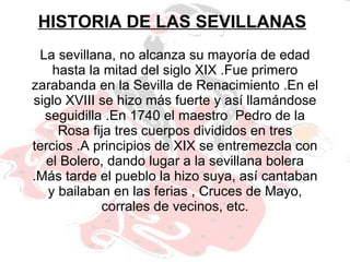 La sevillana evolucionó a lo largo de los siglos en Andalucía, comenzando como la zarabanda en el siglo XV y adoptando su forma actual en el siglo XIX. Tiene una estructura de cuatro coplas separadas por el "bien parao" y se baila y canta típicamente en fiestas andaluzas como la Feria de Abril en Sevilla. A partir de los años 50, artistas como los Hermanos Toronjo y Hermanos Reyes popularizaron las sevillanas más allá de Andalucía a través de discos y pel