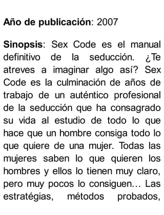 Este documento es una introducción a un manual de seducción titulado "Sex Code" que enseña técnicas y estrategias probadas para atraer a cualquier mujer. El autor comparte historias personales que lo llevaron a dedicar su vida al estudio de la seducción, incluyendo una experiencia que lo hizo tocar fondo y decidir cambiar su suerte con las mujeres. Ahora, a través de este libro, busca ayudar a otros hombres a mejorar en este aspecto tan personal.