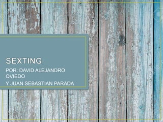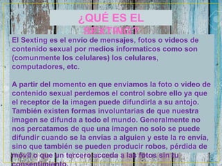El documento define el sexting como el envío de mensajes, fotos o videos de contenido sexual a través de dispositivos electrónicos como celulares y computadores. Explica que una vez enviada esta información se pierde el control sobre su distribución, y ofrece consejos para prevenir el sexting como no ceder a chantajes, denunciarlo y no compartir información comprometedora. Finalmente, detalla los pasos a seguir si se es víctima de sexting, como presentar una denuncia ante las autoridades competentes.