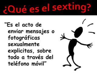 El documento habla sobre los peligros del sexting entre los jóvenes. Explica que el sexting involucra el envío de imágenes o videos sexualmente explícitos a través de teléfonos celulares. Aunque los jóvenes lo ven como un juego, esto puede tener consecuencias graves como la difusión no consentida de las imágenes y daño psicológico. El documento advierte sobre los aspectos legales y riesgos de seguridad asociados con esta práctica cuando involucra a menores de edad.