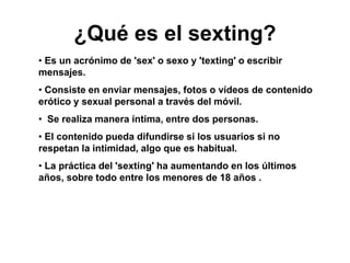 El sexting consiste en el envío de mensajes, fotos o videos de contenido erótico entre dos personas de manera íntima a través del teléfono móvil. Aunque se realiza de forma privada, el contenido puede difundirse si no se respeta la privacidad, especialmente entre menores de 18 años. El sexting puede tener consecuencias legales como la producción y distribución de pornografía infantil, acoso o afectación psicológica si el contenido se comparte sin consentimiento.