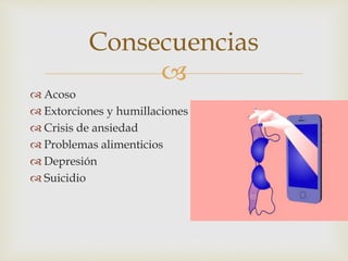 El sexting involucra el envío de fotos, videos o mensajes de contenido sexual a través de dispositivos tecnológicos. Esto puede tener consecuencias como acoso, extorsión, problemas de salud mental e incluso suicidio. Se recomienda no compartir este tipo de contenido privado y evitar contactos con desconocidos para prevenir ser víctima de sexting no consensuado o ciberacoso.