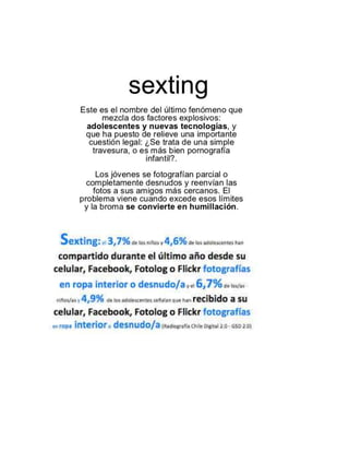 El sexting se refiere al envío de contenido erótico o pornográfico a través de teléfonos móviles, originalmente a través de SMS. Es una práctica común entre jóvenes y adolescentes. Las primeras referencias al sexting datan de 2005 en países anglosajones. Una encuesta de 2008 en EE.UU. encontró que el 22% de las chicas y el 11% de las de 13-16 años habían enviado o publicado fotos desnudas o semidesnudas de sí mismas, y que el 33%