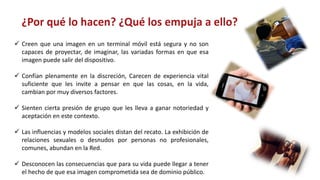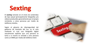 El documento define el sexting como el envío de contenido sexual como fotografías o videos producidos por el remitente a otras personas a través de teléfonos móviles. Según una definición del gobierno de Australia del Sur, el sexting implica el envío de una fotografía sexualmente explícita que una persona se toma a sí misma a otra persona a través de MMS en un teléfono móvil.