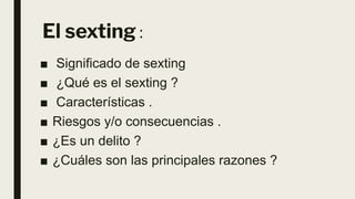El documento resume los conceptos clave del sexting, incluyendo su definición como el envío de imágenes o videos de contenido sexual a través de dispositivos electrónicos. Detalla los riesgos como el acoso, la extorsión y la pornografía infantil, y presenta seis casos donde el sexting llevó al suicidio de adolescentes. Además, explica que el sexting no es ilegal pero puede conllevar delitos como el ciberacoso o la extorsión si no hay consentimiento.