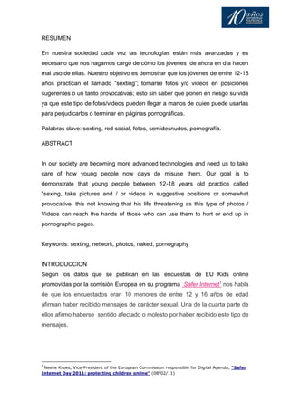Este documento resume una investigación sobre el fenómeno del "sexting" entre jóvenes de 12 a 18 años. Los investigadores aplicaron encuestas que mostraron que el 73% de los encuestados no sabía lo que era el sexting y que el 83% de estudiantes de preparatoria practicaban el sexting sin saber que podía afectar su vida. El estudio concluyó que los jóvenes usan inadecuadamente las tecnologías y redes sociales para sentirse populares al subir fotos sugerentes, sin comprender que esto puede dañar