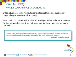 Este documento proporciona consejos para maestros sobre cómo manejar cambios de conducta en estudiantes con autismo. Sugiere identificar las causas de la mala conducta para distinguirla del comportamiento derivado del autismo. Recomienda probar hipótesis sobre los desencadenantes y usar estrategias consistentes y positivas como ignorar ciertas conductas o llevar al estudiante a un área tranquila cuando se porta mal.