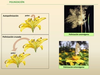El documento describe la reproducción sexual en plantas, incluyendo las partes de la flor involucradas como anteras, estigma y carpelo, y los tipos de polinización como autopolinización, polinización cruzada, anemógama y entomógama. Explica el proceso de fertilización desde que el grano de polen llega al estigma hasta la formación del embrión, y concluye describiendo los factores necesarios para la germinación de semillas como agua, oxígeno, temperatura y humedad.