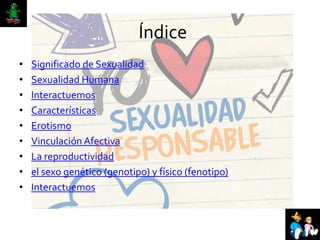 El documento define la sexualidad humana como un aspecto central del ser humano que abarca el sexo, las identidades de género, el erotismo, el placer, la intimidad, la reproducción y la orientación sexual. Explora las cuatro características de la sexualidad: el erotismo, la vinculación afectiva, la reproductividad y el sexo genético y físico. Finalmente, propone preguntas para interactuar sobre estos temas de la sexualidad.