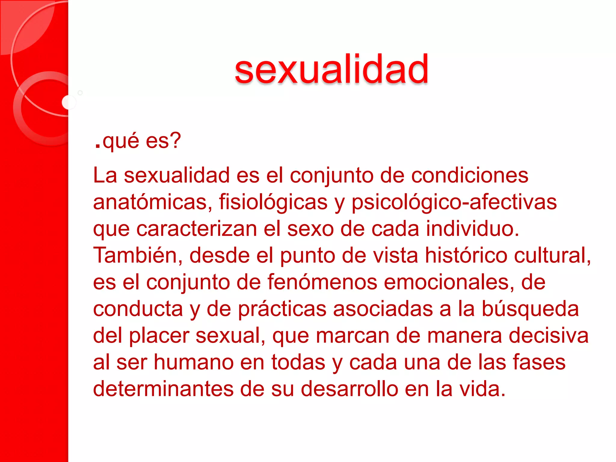 La sexualidad se define como el conjunto de condiciones anatómicas, fisiológicas y psicológicas que caracterizan el sexo de cada individuo, así como los fenómenos emocionales y conductas asociadas con la búsqueda del placer sexual a lo largo de la vida. Se propone que la sexualidad humana se compone de cuatro características interrelacionadas: el erotismo, la vinculación afectiva, la reproductividad y el sexo genético y físico.