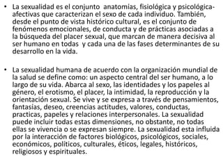 El documento presenta información sobre diversos temas relacionados con la sexualidad humana. Define la sexualidad y explica que incluye dimensiones biológicas, psicológicas y sociales. Describe que la sexualidad forma parte del desarrollo normal en la adolescencia. Además, detalla algunas infecciones de transmisión sexual comunes como el VIH/SIDA, la clamidia, la gonorrea y la sífilis; y cómo se transmiten, sus síntomas y tratamientos.