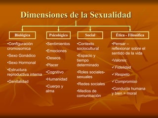 Este documento presenta información sobre la sexualidad humana desde diferentes perspectivas: biológica, psicológica, social y ética. Describe las dimensiones biológicas, psicológicas y sociales de la sexualidad, así como conceptos como el yin y el yang y las diferencias entre los hemisferios cerebrales masculino y femenino. Finalmente, discute varios mitos comunes sobre la sexualidad y promueve una sexualidad responsable.