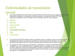 Este documento describe las principales enfermedades de transmisión sexual (ETS), incluyendo clamidia, gonorrea, herpes genital, VIH/SIDA, virus del papiloma humano, sífilis y tricomoniasis. Las ETS se transmiten principalmente a través del sexo sin protección y pueden causar graves problemas de salud, especialmente en mujeres embarazadas y sus bebés. Aunque algunas ETS pueden tratarse con antibióticos, la mayoría no tienen cura y requieren tratamiento de por vida para controlar los síntomas. El uso