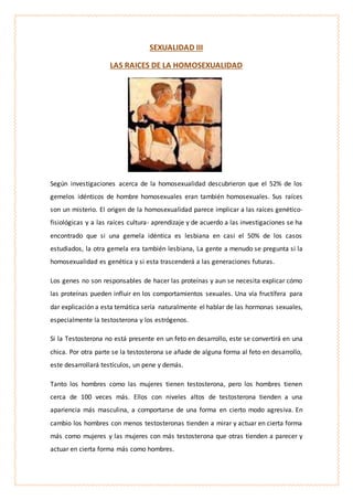 Las investigaciones muestran que la homosexualidad puede tener raíces genéticas y ambientales. Los estudios de gemelos idénticos encontraron que el 52% de los gemelos de hombres homosexuales también lo eran, lo que sugiere una influencia genética. Sin embargo, las hormonas y la crianza también juegan un papel, ya que la exposición a diferentes niveles de testosterona y estrógenos durante el desarrollo puede afectar la orientación sexual. Además, la relación con los padres y los modelos de género observados durante la niñ