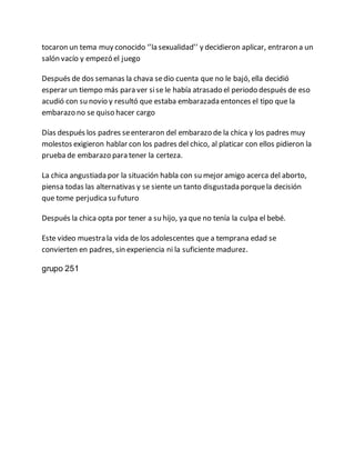Dos estudiantes de bachillerato tuvieron relaciones sexuales en la escuela después de consumir alcohol. Dos semanas después, la chica descubrió que estaba embarazada. El chico no quiso hacerse responsable. Los padres de la chica se enteraron y exigieron hablar con los padres del chico. Finalmente, la chica decidió tener al bebé a pesar de su edad, ya que el bebé no tenía la culpa.
