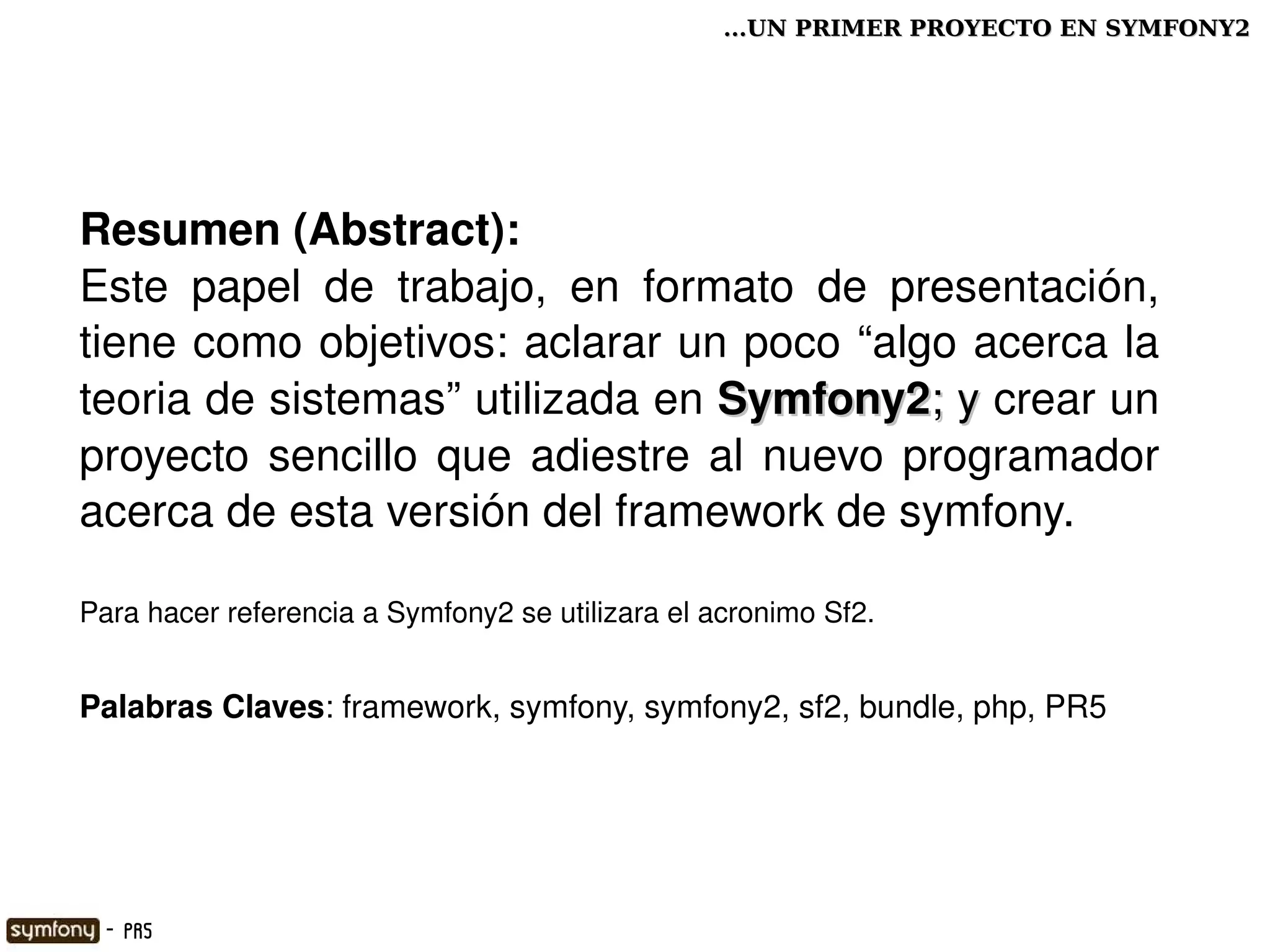 Este documento describe los pasos iniciales para crear un primer proyecto en Symfony2. Explica cómo configurar el entorno de desarrollo con los requisitos de Apache, PHP, Git y MySQL. Luego guía al lector en la creación de la carpeta del proyecto, la configuración básica de la aplicación, y los primeros pasos para generar un bundle llamado MiPrimer que contendrá la lógica del modelo, la vista y el controlador.